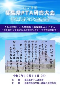 福島県PTA研究大会一次案内、二次案内、大会要項 ○ NEW 第73回福島県PTA研究大会会津若松大会「報告書」 ○ 第73回福島県PTA研究大会会津若松大会「2次案内」 ○ 第73回福島県PTA研究大会会津若松大会「1次案内」 第72回福島県PTA研究大会郡山・田村大会「報告書」 第72回福島県PTA研究大会郡山・田村大会二次案内 第72回福島県PTA研究大会郡山大会一次案内 第71回福島県PTA研究大会二本松大会「報告書」